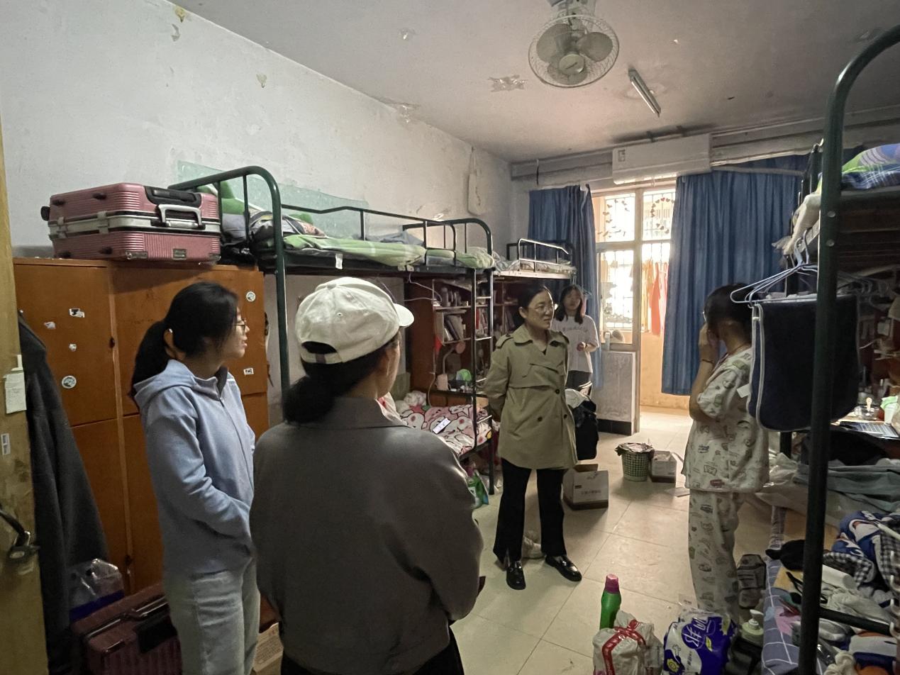 为加强校园安全建设,防患于未“燃”,营造安全、整洁、文明、舒适的安全环境,4月30日上午,beat365中文官方网站党委副书记公金梅带领各班辅导员深入学生宿舍、教室,进行安全隐患排查及宿舍卫生整顿工作。