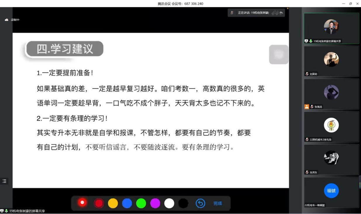 会议初始,张树豪、翟晓源、杜凯、李先浩四位毕业生依次讲述他们在校期间的学习方法、升本过程的筹备以及学习过程中的注意事项等问题,对低年级同学提出许多宝贵的学习建议。分享结束后,同学们就个人学习困惑和升本相关的难题踊跃提问,四位毕业生细心解答相关问题,为同学们的升本规划和备考指点迷津,具有很大的启发作用。最后,团总支刘东指出同学们要坚定目标,早做准备,克服懒惰心理,切忌随波逐流,不断提升自我。