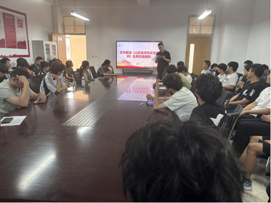 为持续强化校园安全管理,深化学生安全责任意识,6月12日晚,beat365中文官方网站在理工楼2514会议室组织开展《山东省学校安全条例》宣传解读活动。本次会议由辅导员王经旗主讲,各宿舍舍长参加了活动。