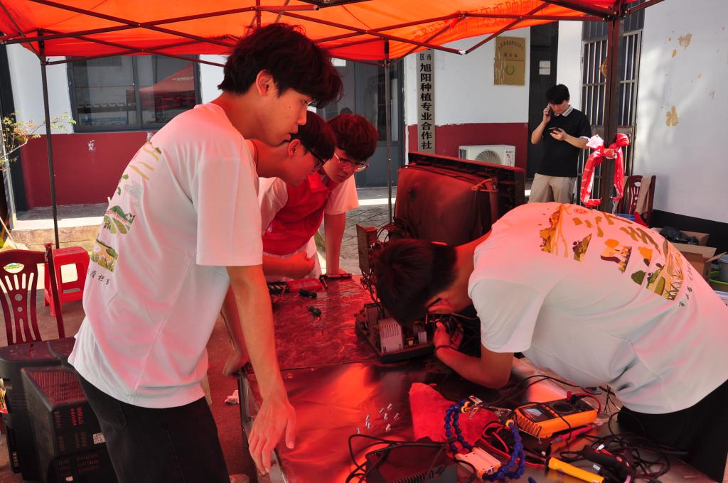 在维修家电活动现场,队员们手持螺丝刀、万用表等工具迅速开展工作,熟练拆卸电器外壳、认真检测电路参数,逐一排查故障隐患。对于能够现场修复的电器,志愿者凭借专业技术使其 “重获新生”;针对无法当场维修的设备,他们耐心向居民说明损坏原因,并提供专业维修建议。