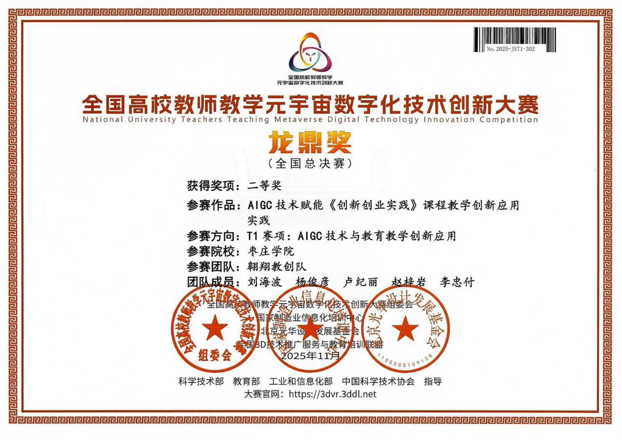 近日,2025年第6届全国高校教师教学元宇宙数字化技术创新大赛全国总决赛圆满落幕。beat365官网beat365中文官方网站由刘海波、杨俊彦等教师组成的教学团队,凭借《AIGC技术赋能创新创业实践课程教学创新应用》成果,在T1赛项“AIGC技术与教育教学创新应用”赛道中表现突出,荣获全国总决赛二等奖。