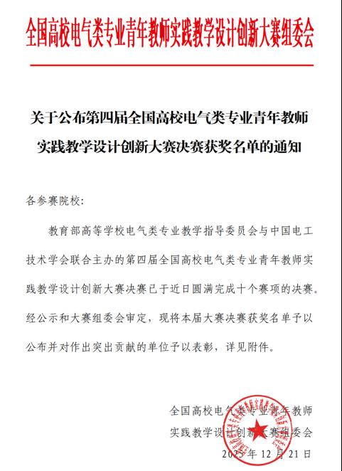 近日,2025年第四届全国高校电气类专业青年教师实践教学设计创新大赛决赛在浙江温州圆满落幕。大赛由教育部高等学校电气类专业教学指导委员会、中国电工技术学会主办。本次大赛共有10个赛项,522支队伍报名,306支队伍晋级决赛,选手来自全国21个省市。beat365官网beat365中文官方网站鞠晓君、晋宏炎、昝玉鹏老师组成的教学团队凭借《基于机智云的嵌入式系统实训开发平台》项目,在“电气自动化系统创新设计竞赛”赛道中荣获全国总决赛二等奖。