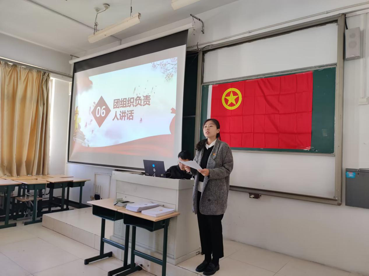 仪式在雄壮激昂的国歌声中拉开序幕。团总支书记刘东介绍了新发展团员的情况,宣读了本次新发展团员名单。随后,各班团支书为新发展团员佩戴团徽,发放团员证。所有团员在团学主席刘天琪同学的带领下,面对鲜红的团旗进行宣誓,新团员在宣誓中表达了挺膺担当、做新时代新青年的决心,老团员重温入团誓词,更坚定了自己的理想信念和青春追求。新团员代表丁寒同学进行发言,表达了自己入团的决心和信念,表示将用实际行动践行自己的入团誓言,不断提高自身素质和修养,努力成为一名优秀的共青团员。随后,刘东老师对新团员表示祝贺,勉励新团员努力奋斗,争当模范,做有理想、敢担当、能吃苦、肯奋斗的新时代好青年,用实际行动为团旗增光添彩。入团宣誓仪式在《光荣啊,中国共青团》歌声中落幕。