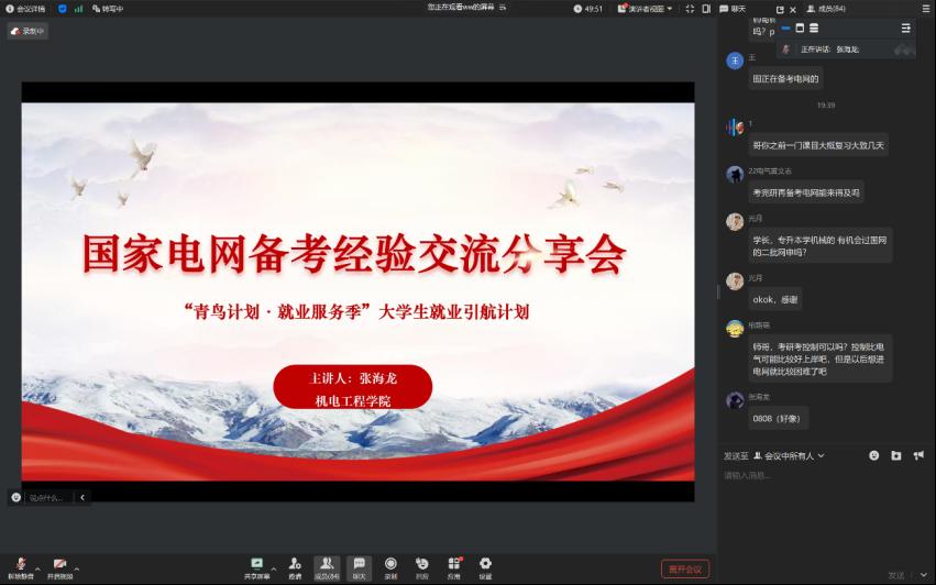 为抢抓寒假黄金期助力学子职业发展,1月23日,beat365中文官方网站开展“青鸟计划·就业服务季”国家电网备考经验交流分享会。这场干货满满的交流会吸引百余学子齐聚云端,应届毕业生张海龙作为特邀嘉宾,携国家电网入职经验倾囊相授,为备考学子点亮职业航灯。