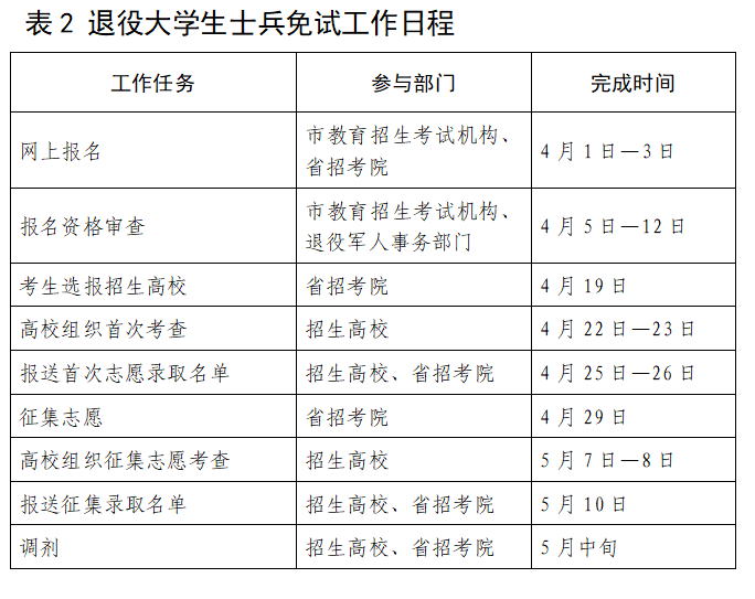 1.退役大学生士兵考生报名资格审核由市级教育招生考试机构和退役军人事务部门共同负责。退役军人事务部门审核考生退役士兵资格及立功受奖情况,市级教育招生考试机构审核考生报考资格,至2024年4月12日前通过管理平台完成资格审核工作。